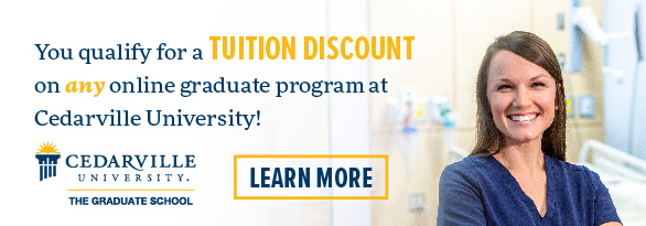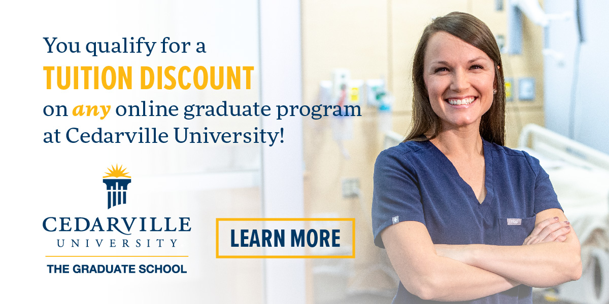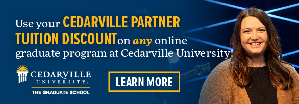 Cedarville offers online graduate programs in business, communication, innovation, leadership, ministry, nursing, and worship. Each program includes a distinct biblical worldview and offers practical, hands-on application. You can complete your program in one to two years in convenient seven-week online courses, and you’ll have a dedicated program advisor who will help you stay on track. And, competitive tuition and the CU Partners discount make Cedarville’s graduate programs an affordable option.